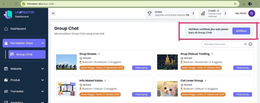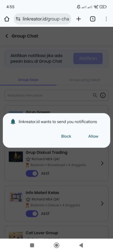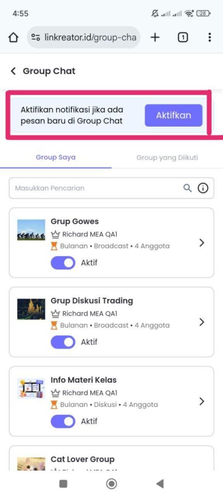 - Aktifkan notifikasi dari Menu Group Chat Saya atau menu lain yang tersedia.