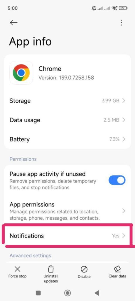 - Cari pengaturan Notifikasi / Site Settings / Permission