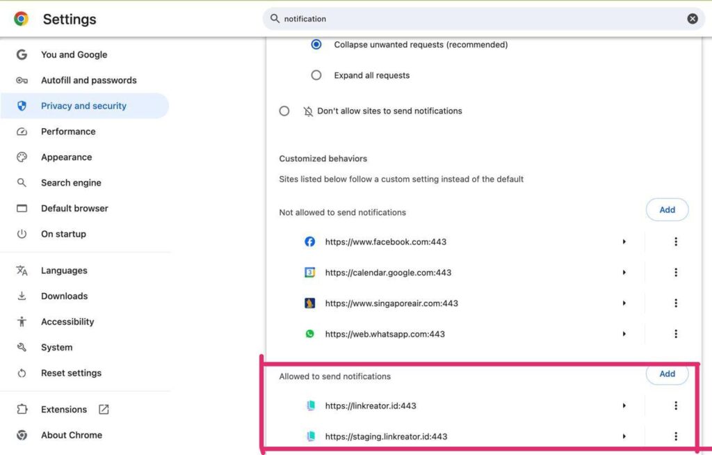 - Apabila terdapat list website di halaman pengaturan anda, cari website “linkreator.id” dan pastikan notifikasi nya juga telah dalam kondisi menyala.