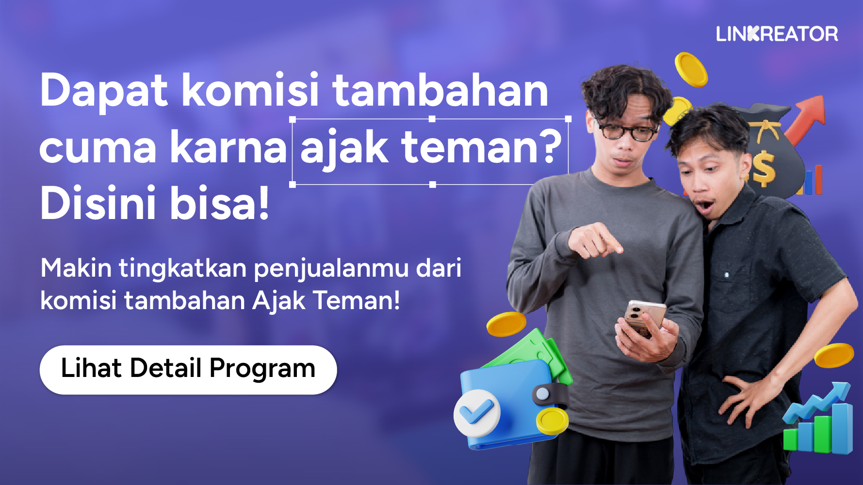 Simpelnya, program Ajak Teman memberikan kesempatan bagi pengguna aktif untuk mengajak teman, keluarga, atau kenalan mereka bergabung dan mulai menjual produk digital menggunakan Linkreator.